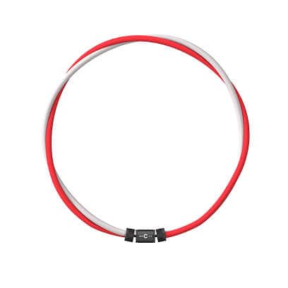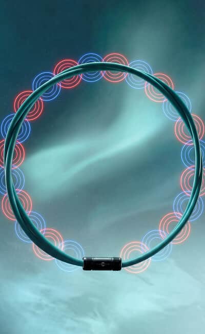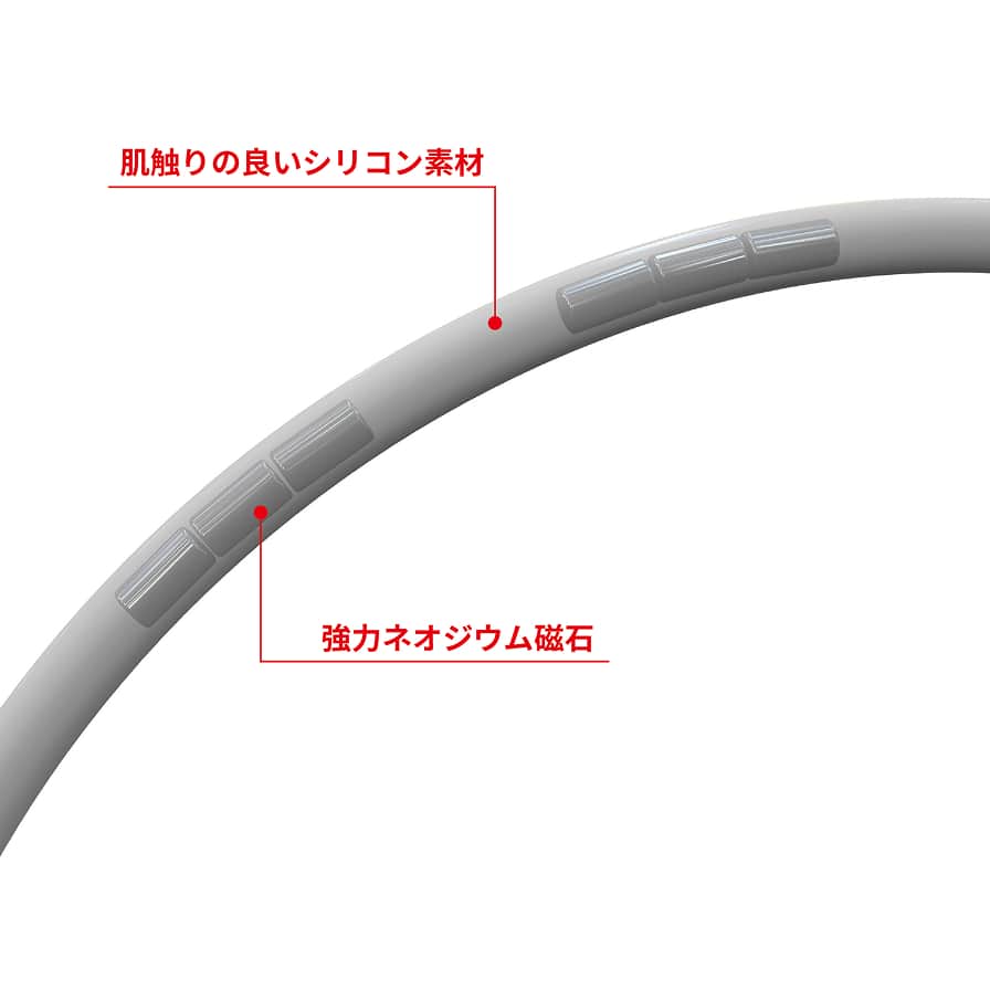 一般的なフェライト磁石の約10倍の磁力を持つ強力なネオジウム磁石を1ループ1本の首元部分に 160mT 磁石 12 個配置。 さらに二重により合計 24 個のハイパワー。