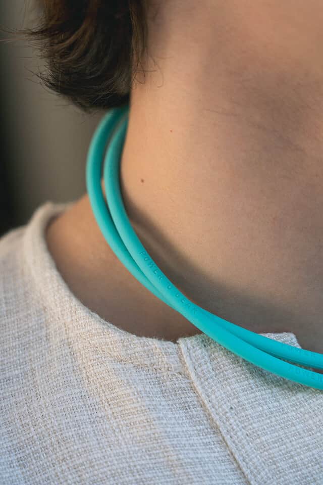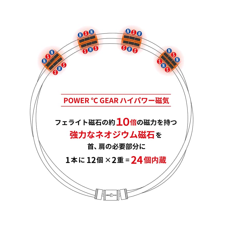 一般的なフェライト磁石の約10倍の磁力を持つ強力なネオジウム磁石を1ループ1本の首元部分に 160mT 磁石 12 個配置。 さらに二重により合計 24 個のハイパワー。